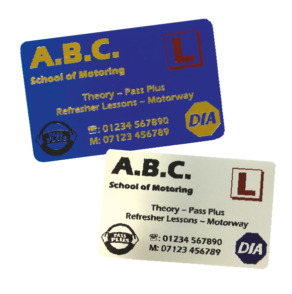 We provide these items in A5 glossy card folded to include a personalised printed insert together with an envelope. You will see from the design opposite, coloured borders, text and metalic red L plates. Samples of the Christmas Card which has a festive picture of Father Christmas with a ripped L Plate can be provided. (Prices will depend upon quantity, colours and artwork).