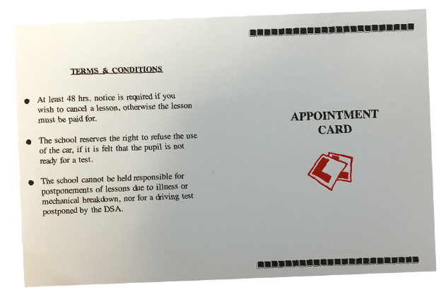 We also offer a progress card or progress/appointment cards, these can be personalised if required at a small extra charge. These can be used as your pupil progress through their tuition.
