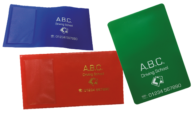 In coloured PVC, personalised with your details on front (print and wallets available in lots of different colour combinations). These wallets are suitable for holding the driving licence, appointment card or similar.